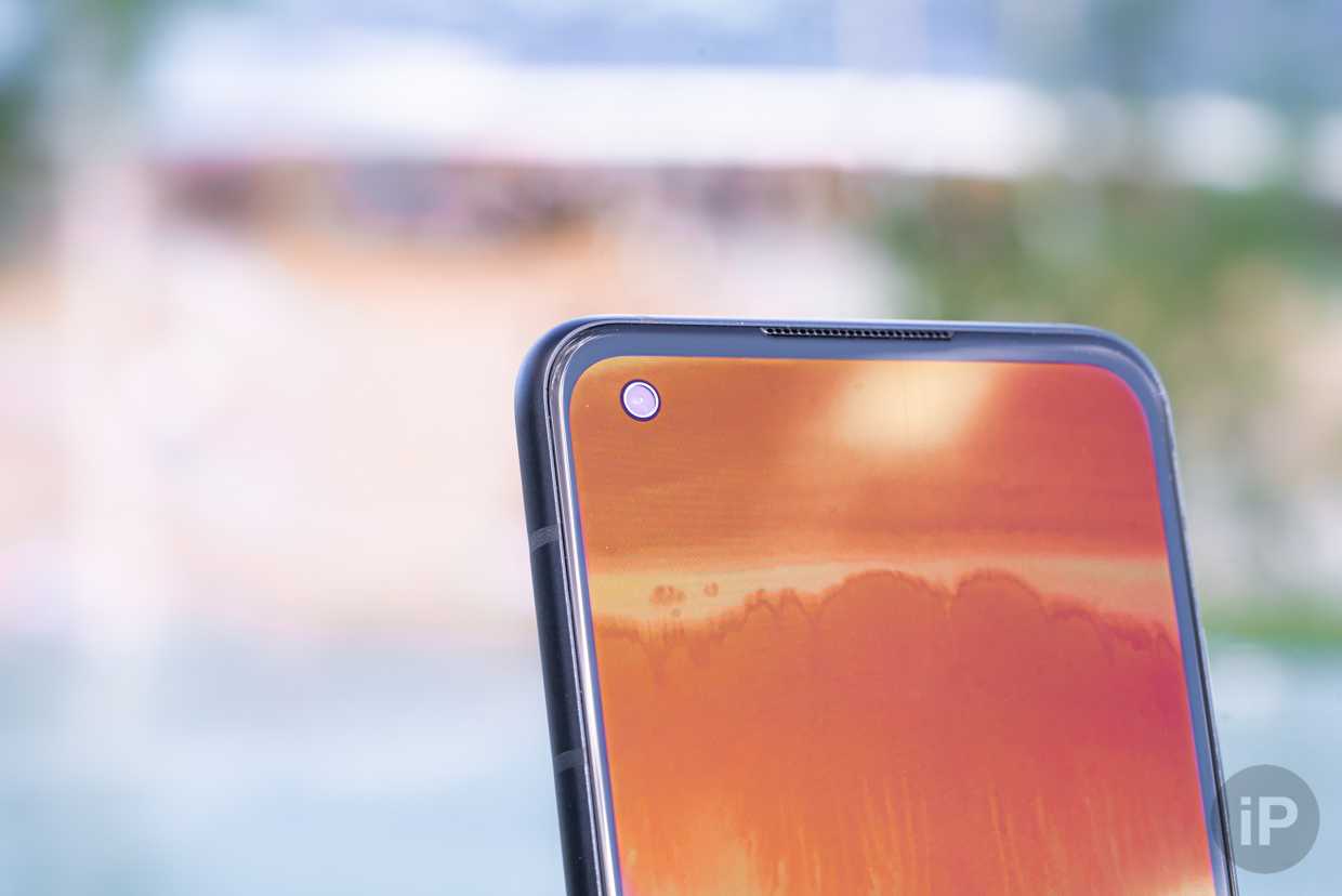Переднее стекло у смартфона слегка скруглённое. Это — Corning Gorilla Glass Victus. Дисплея имеет диагональ 5,9” и соотношение сторон 20:9. Также корпус защищён от влаги и пыли по стандарту IP 68 (нахождение под водой на глубине до 1 метра).