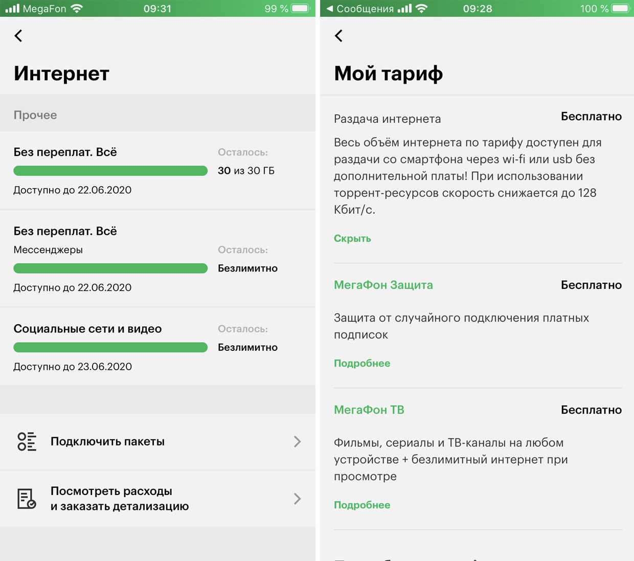 Во всех тарифах также есть несколько дополнительных услуг: доступ к мессенджерам даже при отрицательном балансе, а также базовый пакет онлайн-телевидения МегаФон ТВ (63 канала) с неограниченным трафиком. В некоторых – ещё и безлимитный трафик в популярных соцсетях.