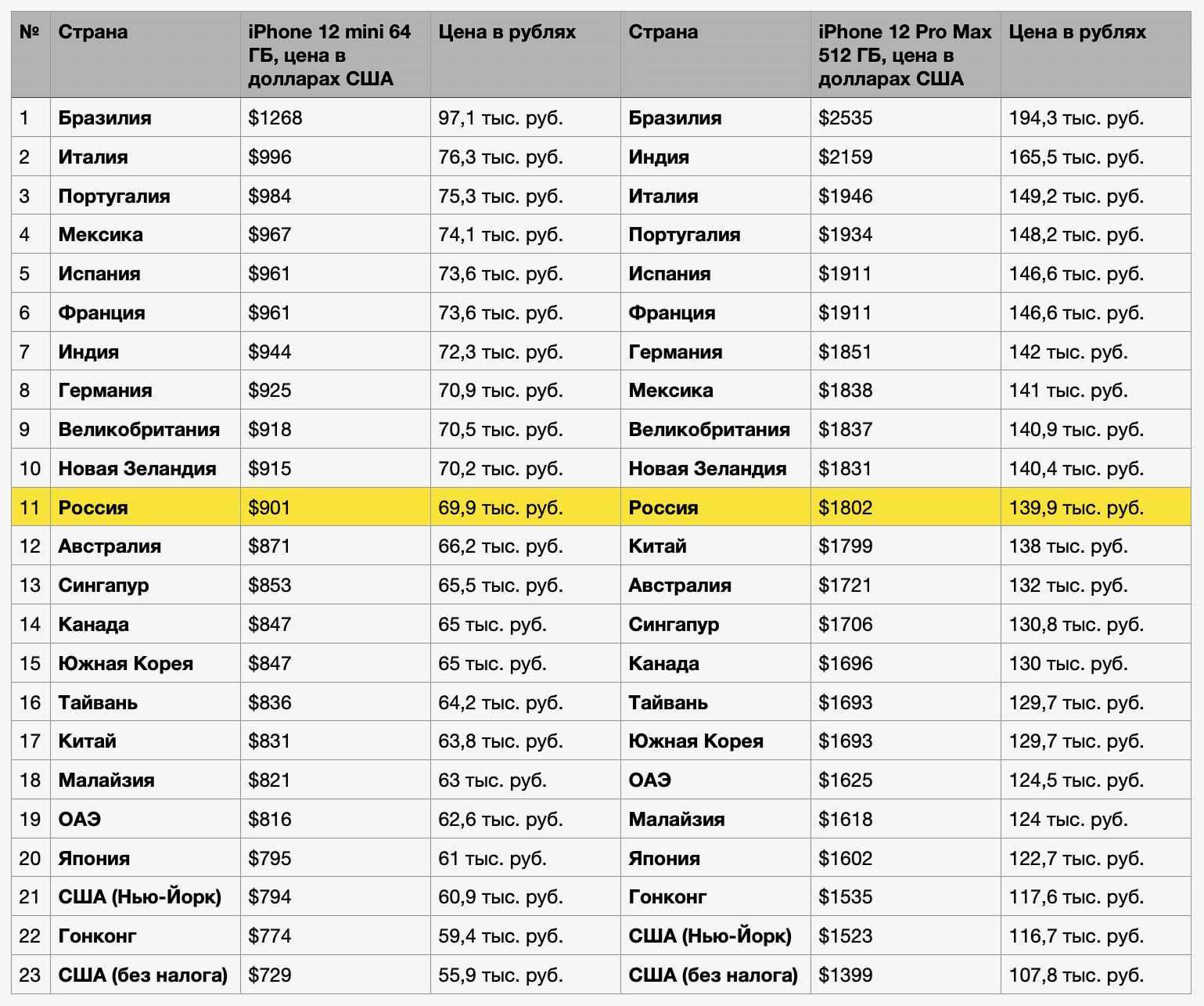 Что касается России, то мы находимся примерно в середине рейтинга на четвертой позиции с 1101 и 1296 долларами за iPhone 12 и iPhone 12 Pro соответственно. Примерно столько же за айфоны просят и в Великобритании.