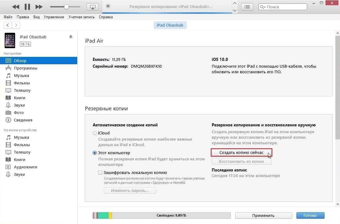 5. Нажмите «Создать резервную копию» и дождитесь завершения процесса.