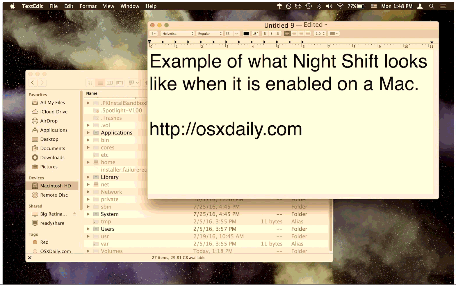 Важно отметить, что, хотя при включении Night Shift цвета дисплея становятся теплее, эти более теплые цвета не переходят на изображения, картинки, снимки экрана или что-либо еще, созданное на дисплее. Таким образом, чтобы продемонстрировать эффект, вам нужно либо протестировать его самостоятельно на экране Mac, либо создать макет, как мы сделали ниже