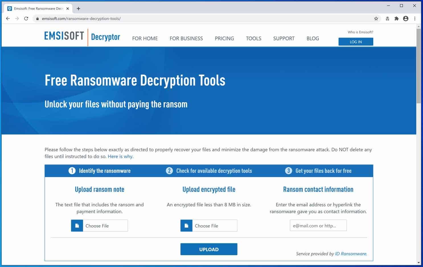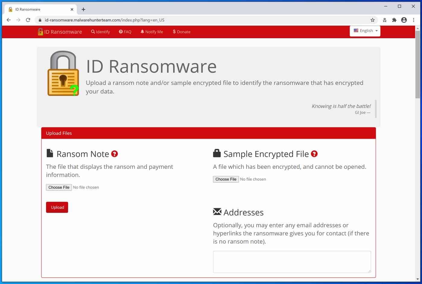 Вы можете попробовать восстановить зашифрованные файлы с помощью Инструменты дешифрования ID Ransomware. Чтобы продолжить, вам необходимо загрузить один из зашифрованных файлов и идентифицировать программу-вымогатель, которая заразила ваш компьютер и зашифровала ваши файлы.