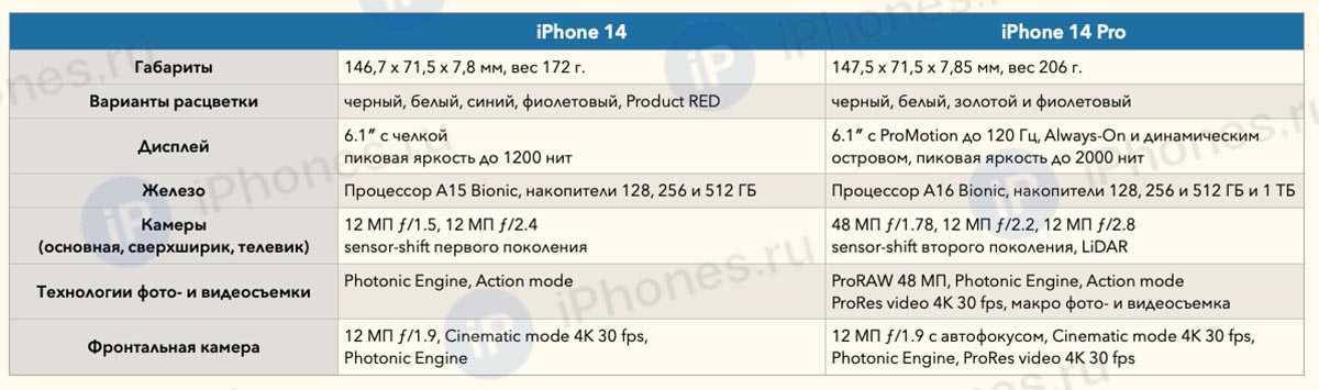 Вывод: iPhone 14 / 14 Plus сохранили прошлогодний процессор, но повысили свое быстродействие за счет возросшего объема оперативной памяти. А вот iPhone 14 Pro / 14 Pro Max мало того, что получили новый быстрый и энергоэффективный процессор, получили больший объем быстрой оперативной памяти, они лучше будут работать с графикой. Наконец, именно «прошки» выпускаются с топовым объемом накопителя на 1 Тб.