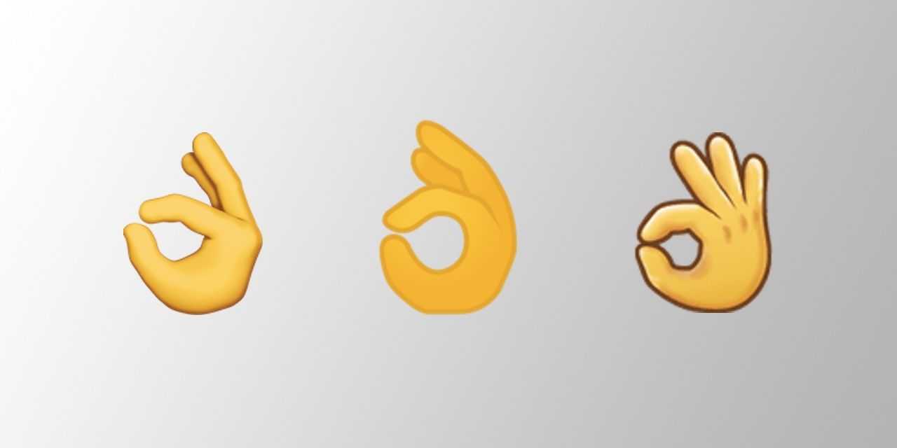 Above (left to right): How the OK Hand emoji displays on Apple, Google, and Samsung.