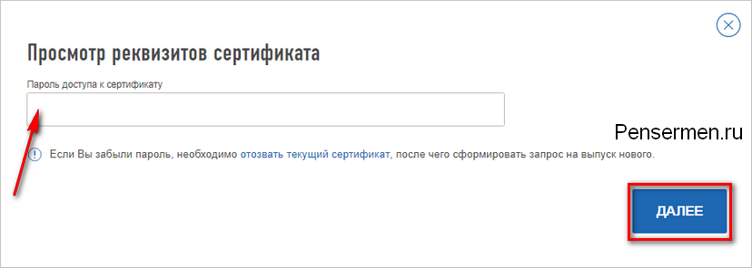 В течение нескольких секунд на телефон придет СМС с кодом, который и является паролем от сертификата. Его вводят в соответствующее окно: