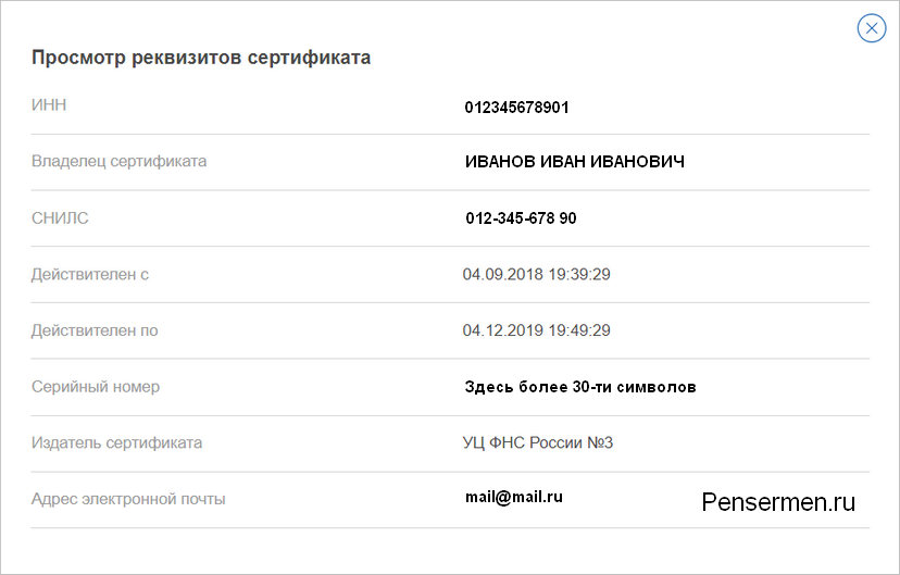 А уже в следующем окне любуйтесь своим сертификатом, смотрите эти самые реквизиты, которые сверяют в налоговой при получении от Вас документов. Выглядит он примерно так: