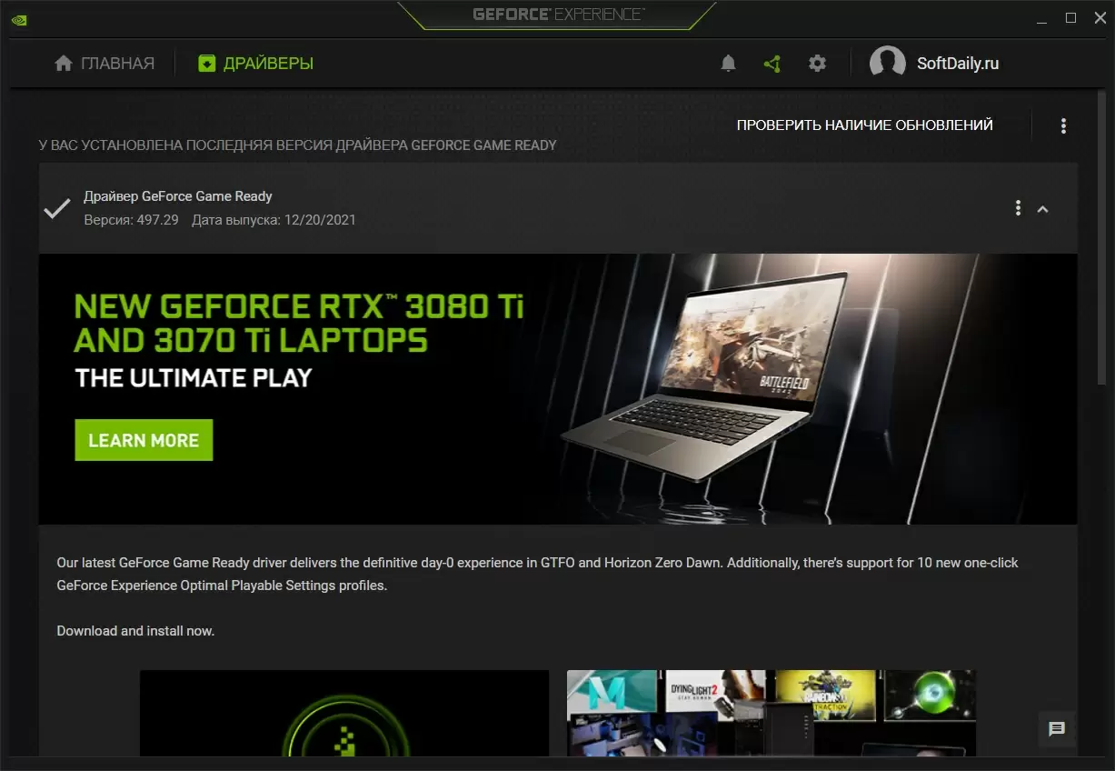Для своевременного обновления драйверов также можно использовать отдельную утилиту GeForce Experience, которая, используя облачный центр обработки данных, предупреждает о появлении обновленных драйверов, качает последние драйверы и устанавливает на ПК. GeForce Experience создаст в системе оптимальные параметры для всех установленных игр.