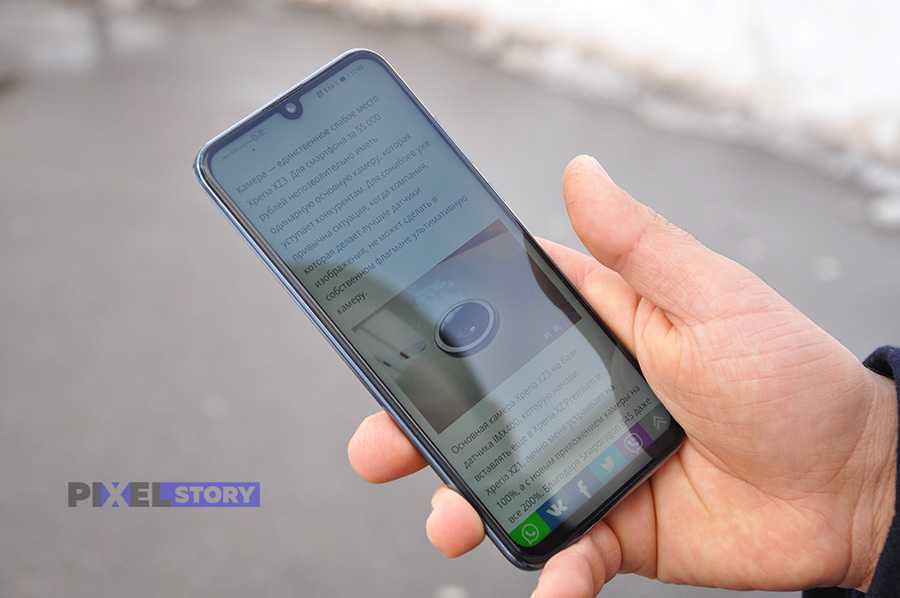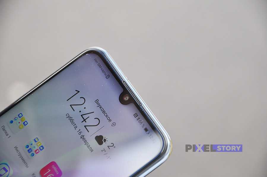 Благодаря тонким рамкам вокруг дисплея смартфон не кажется крупным. Вместо внушительного выреза а-ля iPhone здесь имеется небольшой каплевидный выступ под фронтальную камеру. Смотрится гармонично, к тому же остаётся больше места для уведомлений в верхней части экрана. С учётом тонких рамок по бокам, кажется, будто кромок у гаджета нет совсем. Кроме того, сверху и снизу отступы также небольшие. Кстати, точечный индикатор оповещений переместился на нижнюю рамку. А вот динамик аккуратно встроен в верхнюю грань над дисплеем в виде тонкой полоски.
