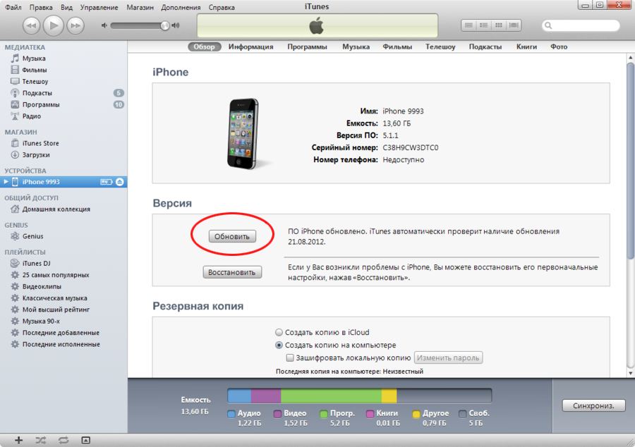 - С помощью iTunes. Требует проводного соединения телефона и ПК, а также выхода в интернет с компьютера.