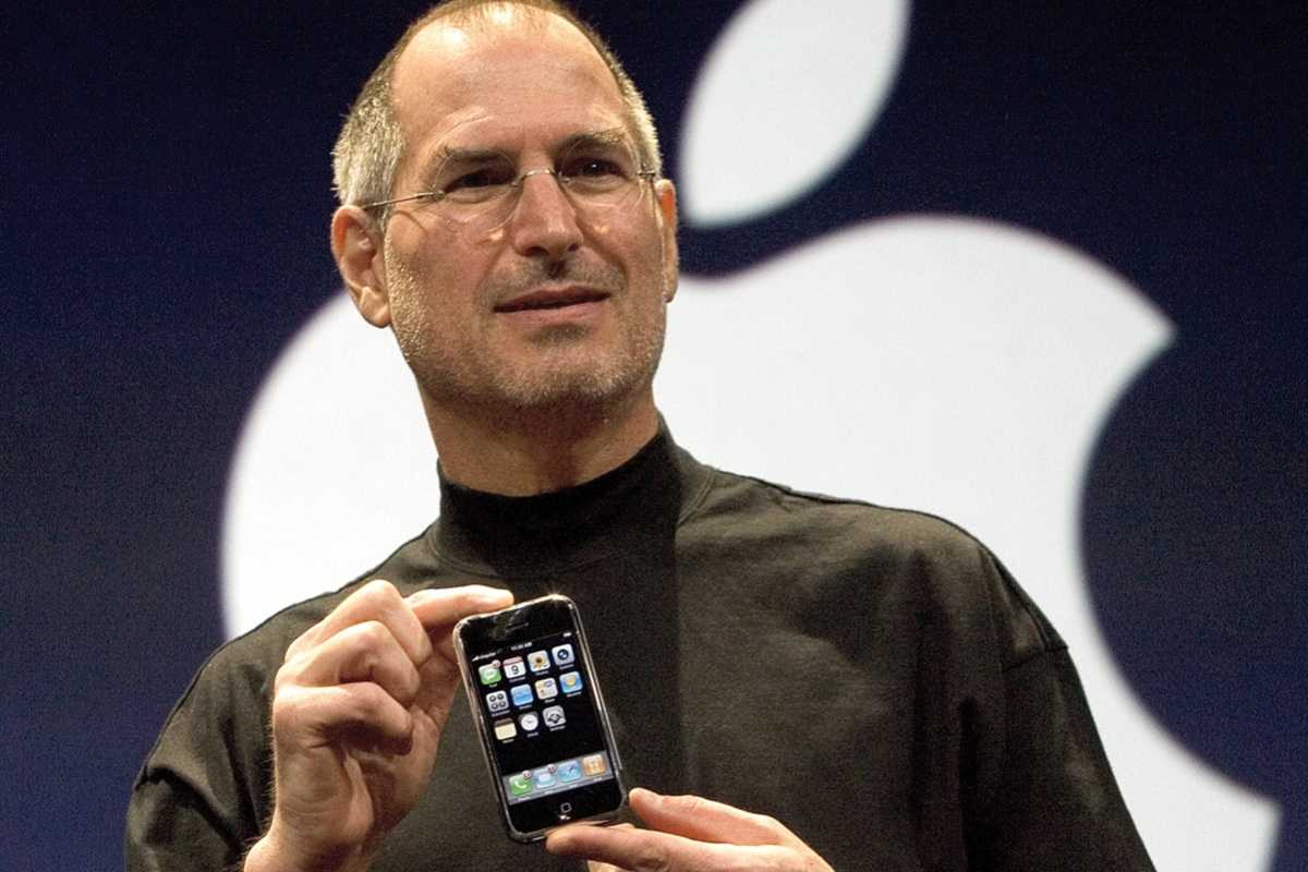 Steve Jobs holding the first iPhone at the launch in 2007.