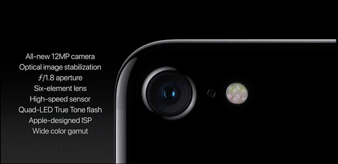 Разрешение матрицы основной камеры iPhone 7 не изменилось – 12 Мп, но при этом линза теперь состоит из 6-ти элементов, увеличилась светосила (ƒ/1.8 вместо ƒ/2.2), а также появилась аппаратная система оптической стабилизации изображения (в предыдущем поколении использовалась только в спецификации “Plus”).