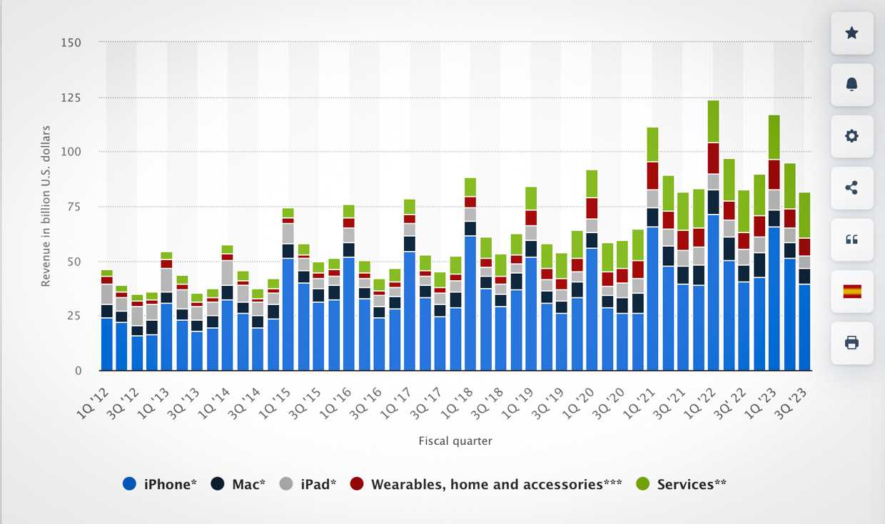Распределение доходов Apple. Зелёное – сервисы, единственное направление, которое стабильно растёт и не скачет от квартала к кварталу. Поэтому смартфоны Apple до сих пор не растут в цене