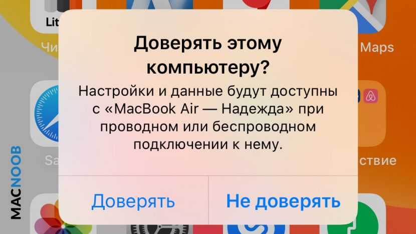 - Убедитесь, что между iPhone и компьютером установлено доверие. При первом подключении на обоих устройствах будут отображены запросы на разрешение доступа к данным.