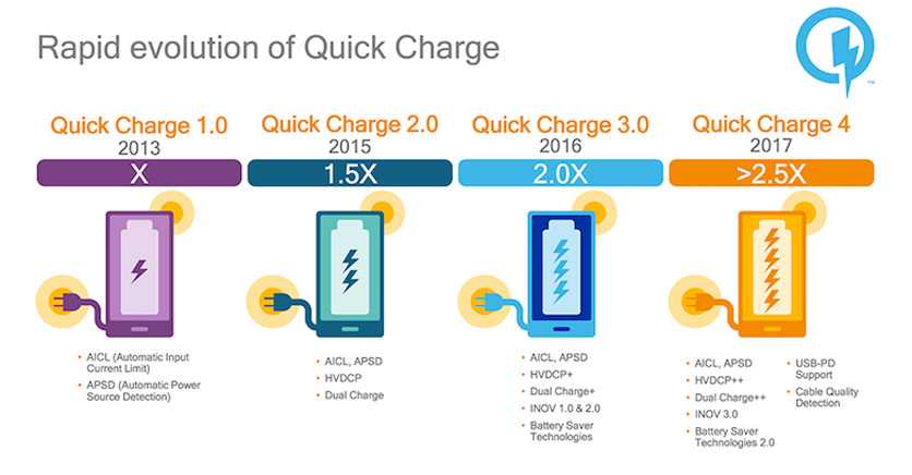 Qualcomm Quick Charge — самая распространенная технология быстрой зарядки на данный момент. Она положила начало всем остальным типам подобных технологий. На сегодняшний день вышла уже четвертая версия Quick Charge.