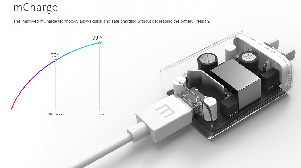 Meizu использовала прототип смартфона с батареей 3000 мАч. Пятиминутное подключение к сети обеспечило смартфон 30% заряда, а 60% уже спустя 10 минут.
