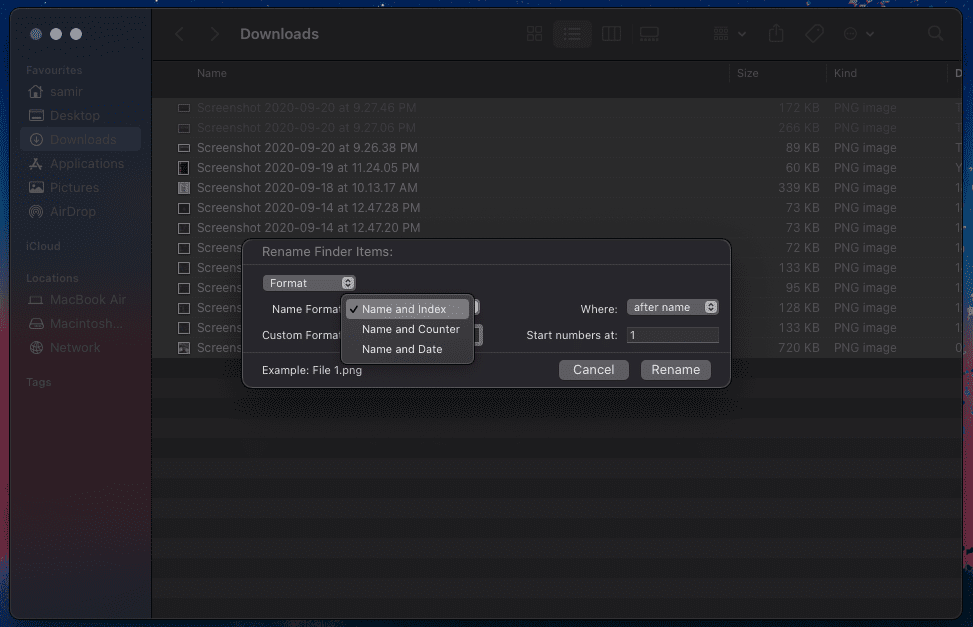 Существует три формата: «Имя и индекс» (пример: File1.jpg), «Имя и счетчик» (пример: file00001.jpg) и «Имя и дата» (пример: файл 2016-09-08 в 1.05.47. PM.jpg).
