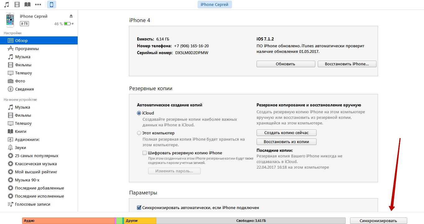 . Проследуйте в меню управления устройством в iTunes (нажав кнопку, на которой изображён смартфон) и произведите синхронизацию гаджета с медиакомбайном.
