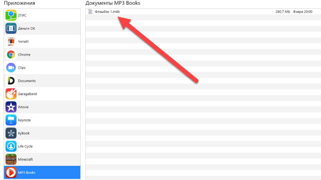 А вот вторая утилита работает в связке с iTunes. Без закачки с компьютера не обойтись (по крайней мере для юзеров, чей iPhone ниже iOS 13), а после этого файл нужно копировать в раздел «Общие файлы», а затем в «Программы». Если вы загрузили аудиокнигу в m4b через браузер (напомним, что такая возможность есть iOS 13 и выше), то задача значительно облегчается – достаточно открыть файл в папке «Загрузки».