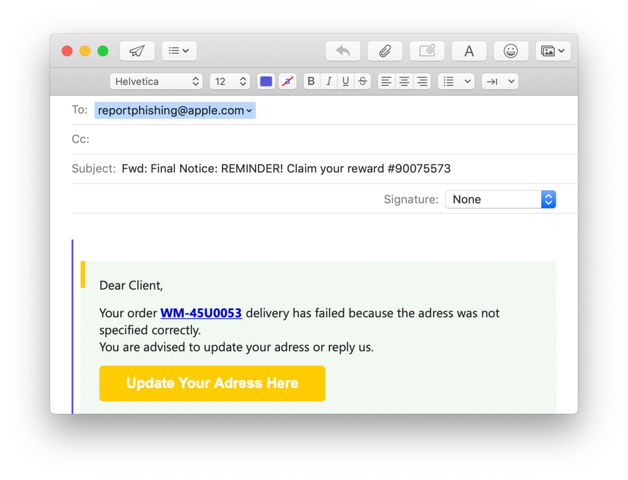Большинство этих фишинговых писем содержат плохую грамматику и пунктуацию, а также слова с ошибками. Вы также заметите предложения, которые не начинаются с заглавной буквы, и слова, написанные случайным образом с заглавной буквы, потому что электронное письмо было написано в спешке.
