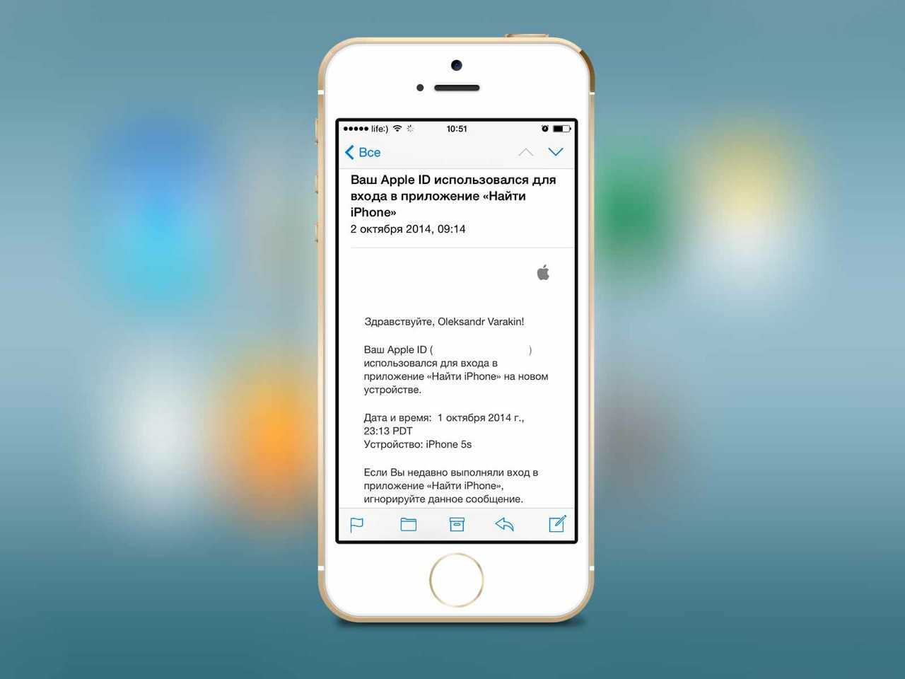 - Если вашу учетную запись использовали для авторизации в приложении «Найти iPhone» на iOS-девайсе, письмо будет следующего содержания: «Ваш Apple ID (адрес электронной почты) использовался для входа в приложение «Найти iPhone» на новом устройстве. Дата, время, модель устройства с которого осуществлялся вход.