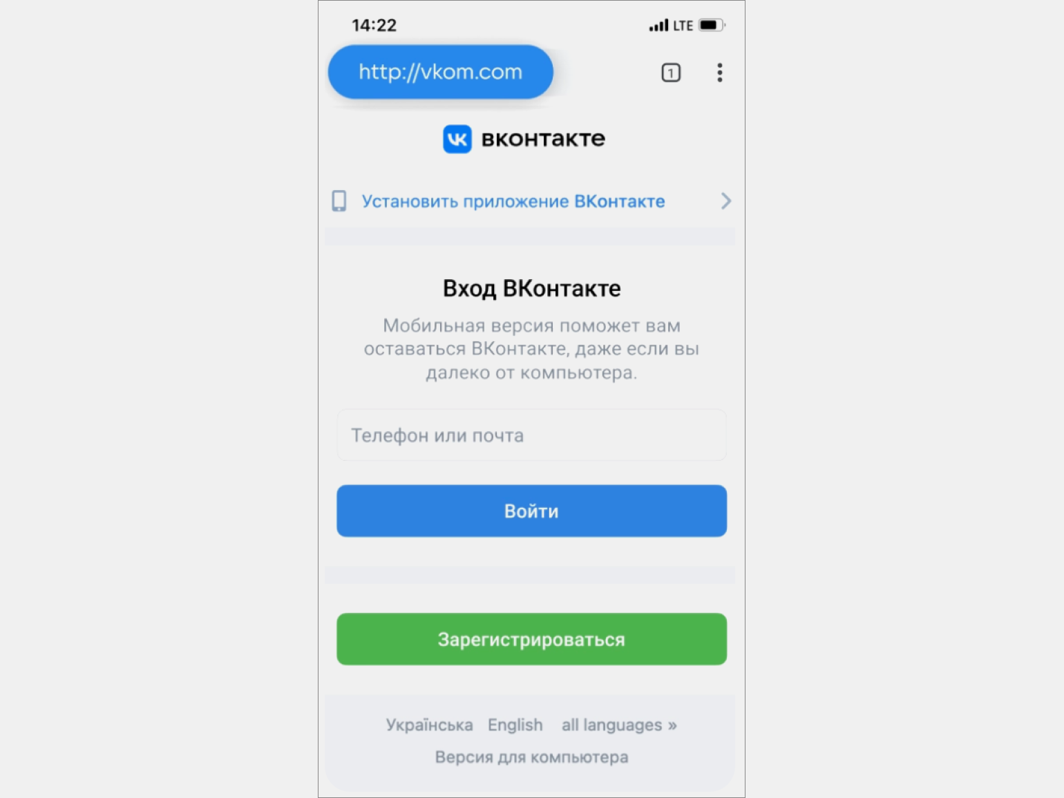 Форма для авторизации выглядит так же, как и на официальном сайте VK. Но вместо привычного vk.com в адресной строке видим vkom.com. Здесь лучше не авторизовываться — логин и пароль попадут в руки мошенников.