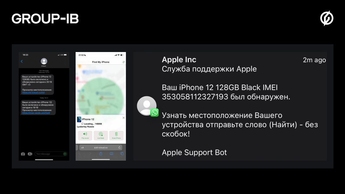 Но фоне появления новых мошеннических схем специалисты Центра реагирования на инциденты информационной безопасности CERT-GIB предупреждают об активизации фишинга, связанного с угоном аккаунта Apple ID. Обычно, мошенники находят телефонный номер человека, который лишился своего iPhone, например, его смартфон был украден или потерян, и отправляют ему фейковые SMS или сообщения в мессенджере от имени техподдержки Apple Inc или сервиса iCloud. Как правило, в сообщении говорится, что iPhone был включен и «локатор» обнаружил его местонахождение.