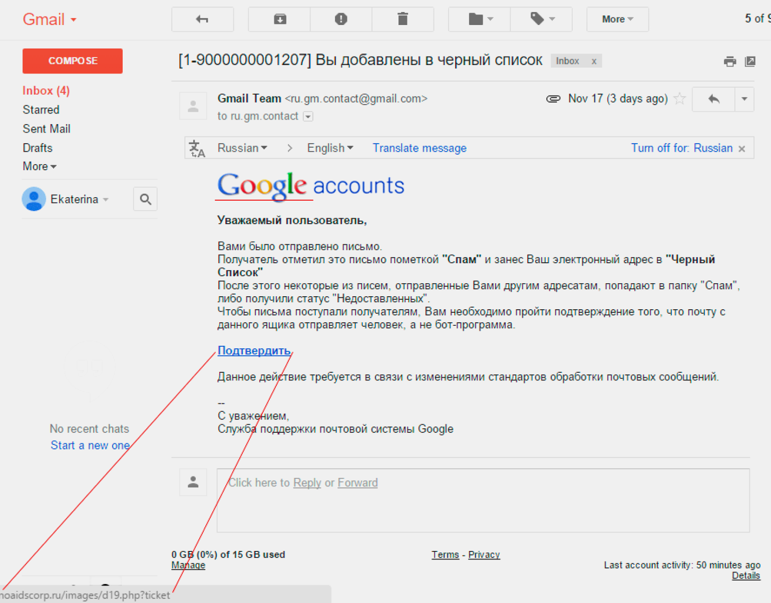 Человек может решить, что он получил запрос от Google: есть логотип компании, официально написанный текст, подпись в письме и почтовый ящик, намекающий на связь с компанией. Но почтовый ящик с доменом gmail.com может зарегистрировать любой пользователь. Если навести курсор на текст, на который поставили ссылку, то видно, что она ведёт на сайт с доменом .ru, который не имеет ничего общего с Google.