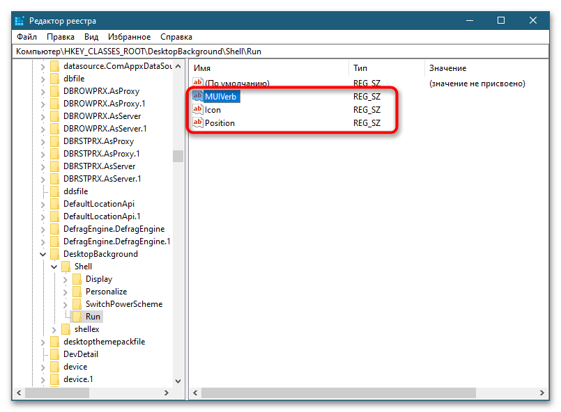 Создайте строковые параметры «MUIVerb», «Icon», «Position».