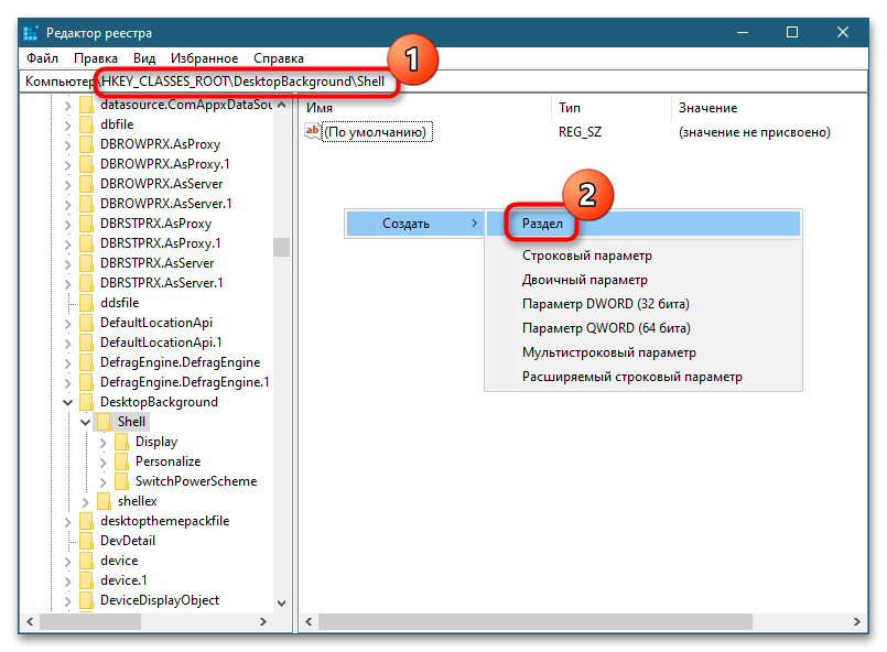 - Запустив «Редактор реестра», разверните ветку . Последний подраздел может содержать несколько вложенных каталогов, в том числе созданных прописавшимися в контекстное меню «Рабочего стола» сторонними программами. Как правило, название таких каталогов соответствует названию создавшей их программы.