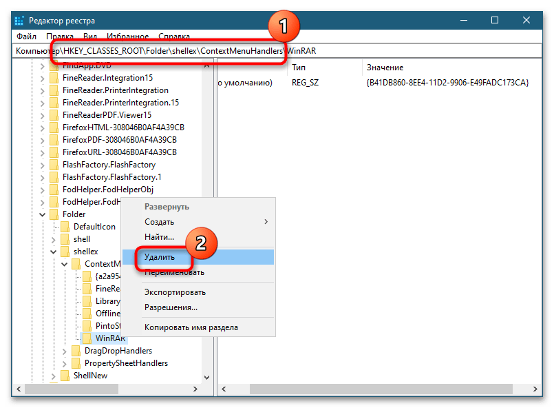 - Чтобы убрать из меню добавленный сторонней программой пункт, удалите соответствующий ей подраздел в указанном ключе реестра.