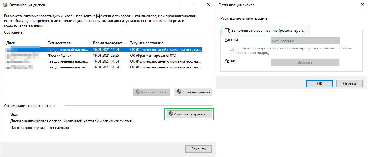 Рис. 8. Включение/выключение дефрагментации SSD-накопителя в Windows