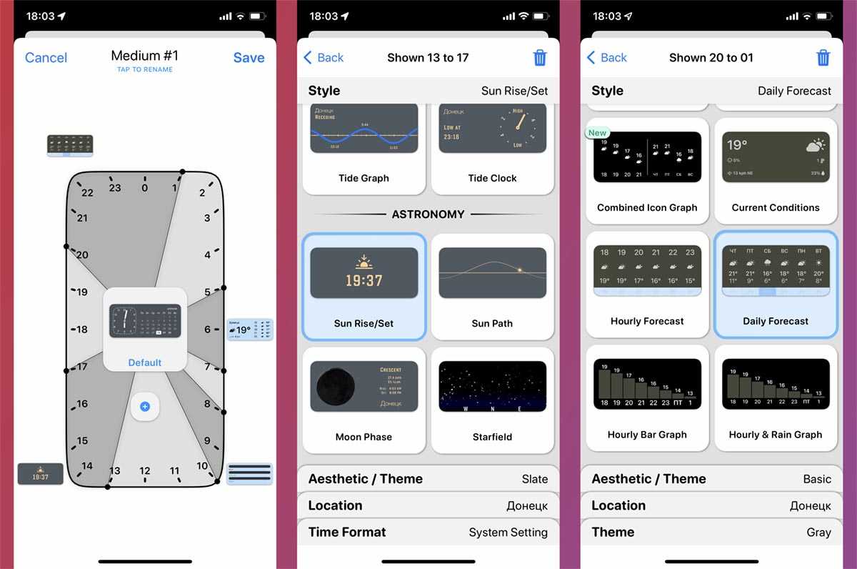 В каталоге Widgetsmith есть множество виджетов для отображения даты и времени, есть виджеты с фото из галереи, карточки с отображением данных из календаря или напоминаний, множество погодных виджетов, карточки с информации об активности пользователя и несколько астрономических виджетов.