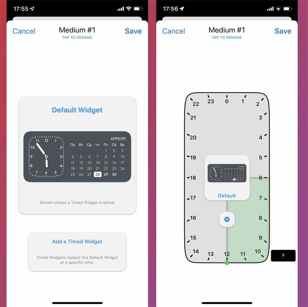 7. Откроется круговая диаграмма с возможностью настройки разных виджетов в зависимости от времени суток. Нажмите “+” для добавления нового виджета и установите временные рамки его отображения.