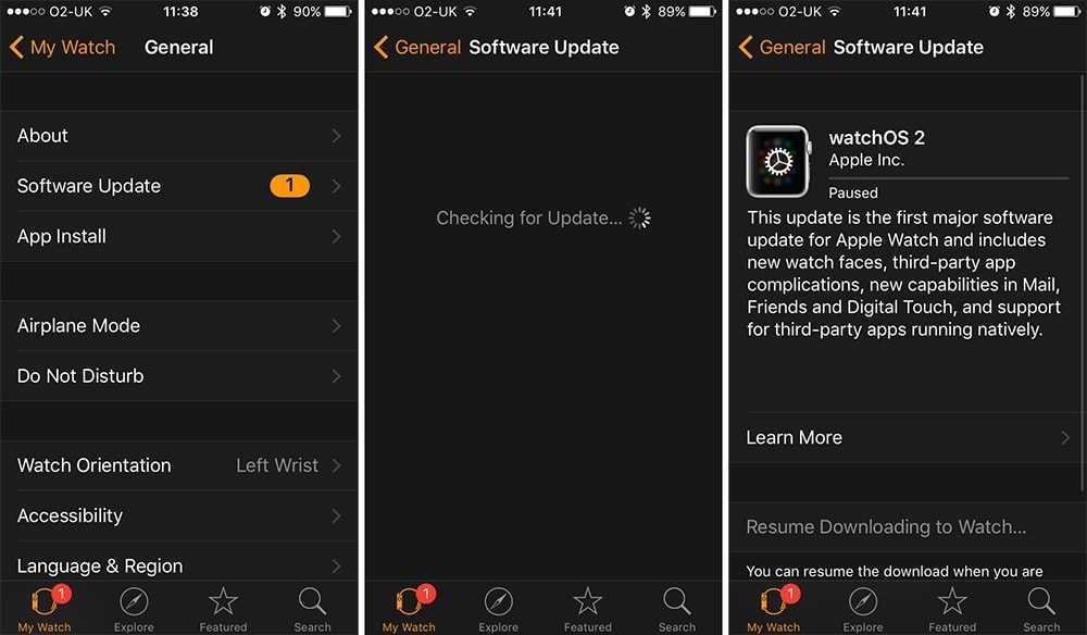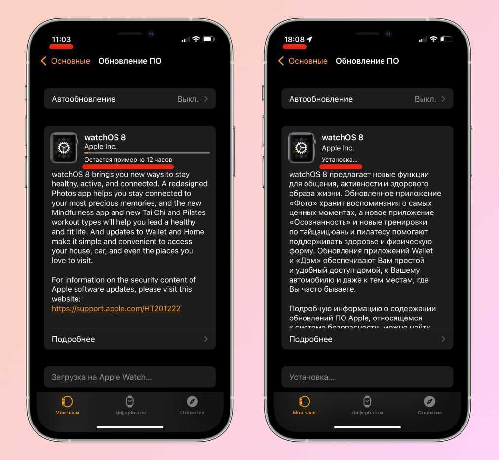 Во время обновления не снимайте часы Apple Watch с зарядного устройства. Не перезапускайте iPhone и Apple Watch и не закрывайте приложение Apple Watch. Когда обновление завершится, часы Apple Watch перезапустятся автоматически.