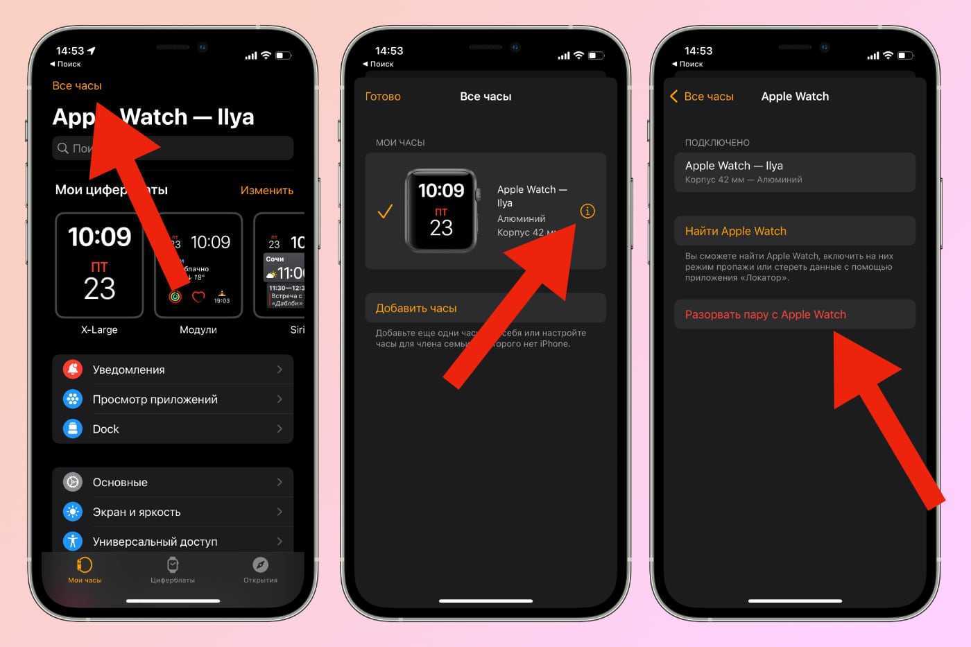При разрыве сопряжения с Apple Watch на часах возвращаются заводские настройки. Чтобы разорвать пару, нужно разместить телефон и эппл вотч на близком расстоянии друг от друга: