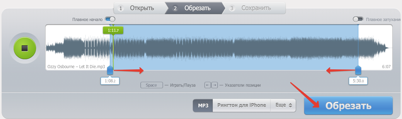 Используя указанные инструменты и значки стрелочек в верхней части редактора, произведите обрезку в соответствии с требованиями, по необходимости используя встроенный плеер для прослушивания результата. По завершении в нижней части страницы следует воспользоваться отмеченной кнопкой для сохранения результата.