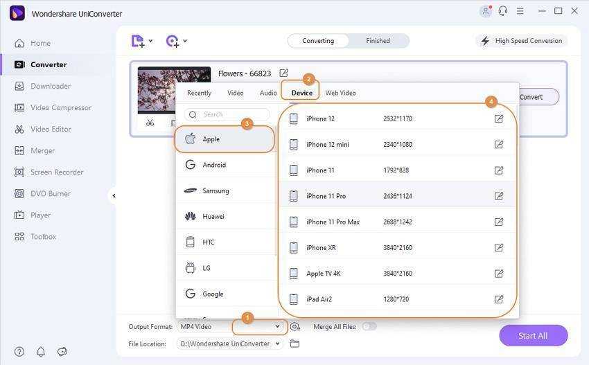 После того, как вы выполнили редактирование, нажмите на опцию Выходной формат: чтобы открыть выпадающее меню, выберите формат iPhone на вкладке Устройство. Вы можете пропустить этот шаг, если ваш видеоформат совместим с iPhone.