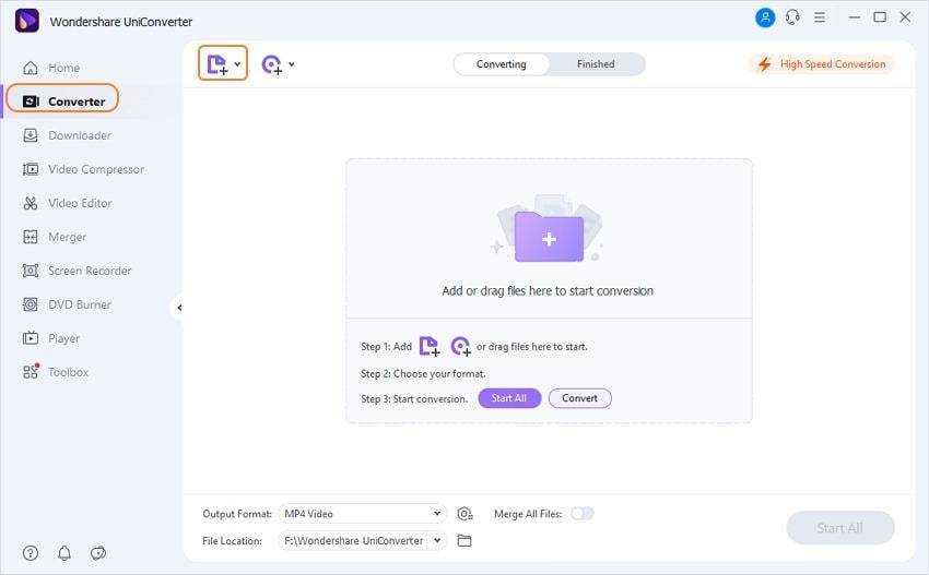 Загрузите, установите и запустите Wondershare UniConverter (первоначально Wondershare Video Converter Ultimate) на вашем компьютере Windows или Mac, нажмите на кнопку на вкладке Video Converter чтобы загрузить видео, которое вы хотите сократить для iPhone.