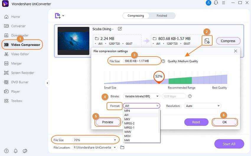 Чтобы изменить размер или сжать видео, нажмите на Значок сжатия на целевой панели, и откроется небольшое окно. В этом окне вы можете настроить размер файла,разрешение, качество и битрейт. Вы также можете просмотреть видео, нажав на кнопку предварительного просмотра. Нажмите на кнопку OK чтобы завершить изменения.