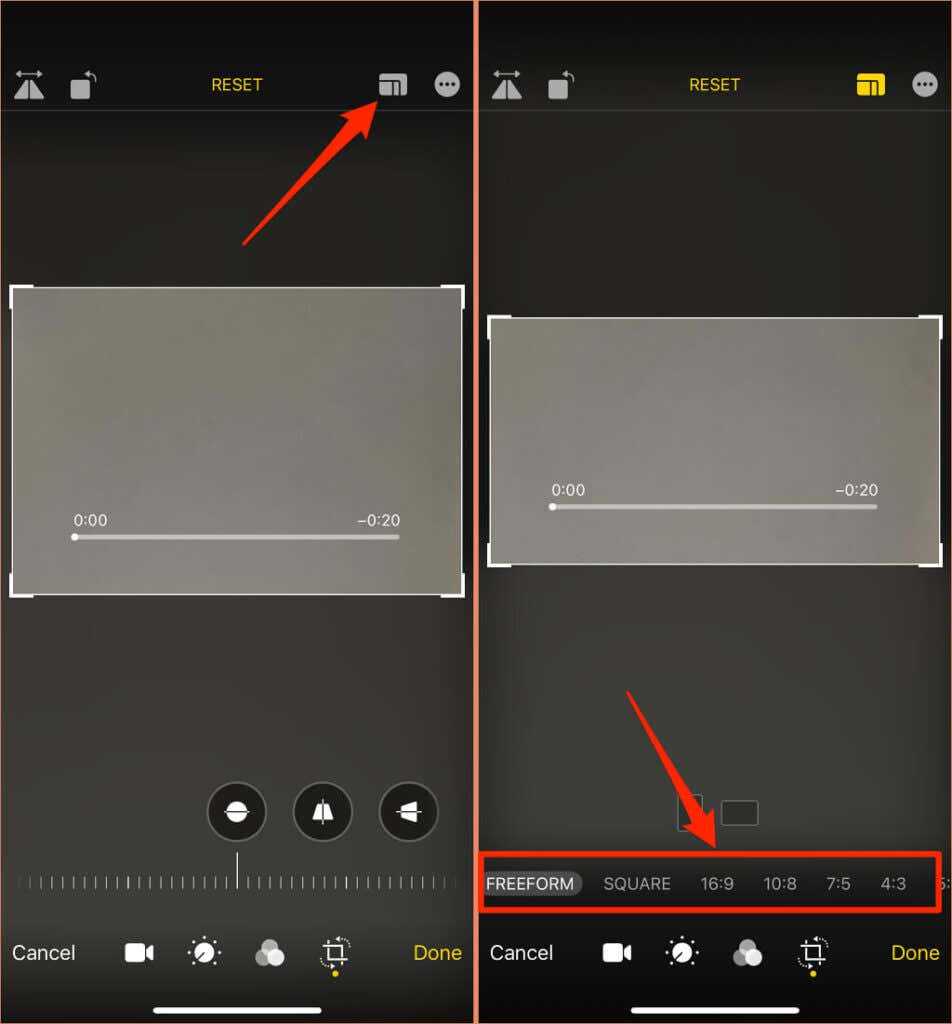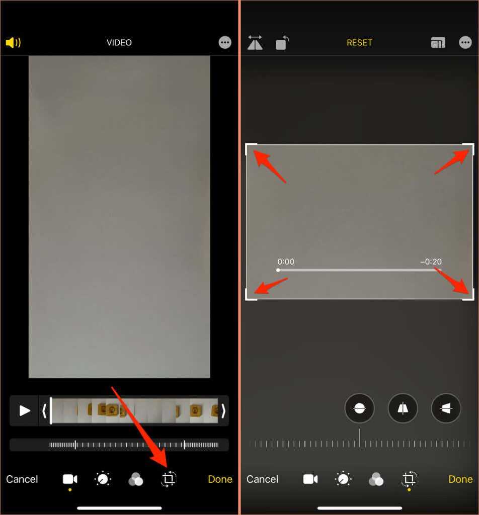 Want to change the size or dimensions of a regular or slo-mo video? Tap the crop icon in the bottom menu and drag the corners of the outline to the video section you want to keep.