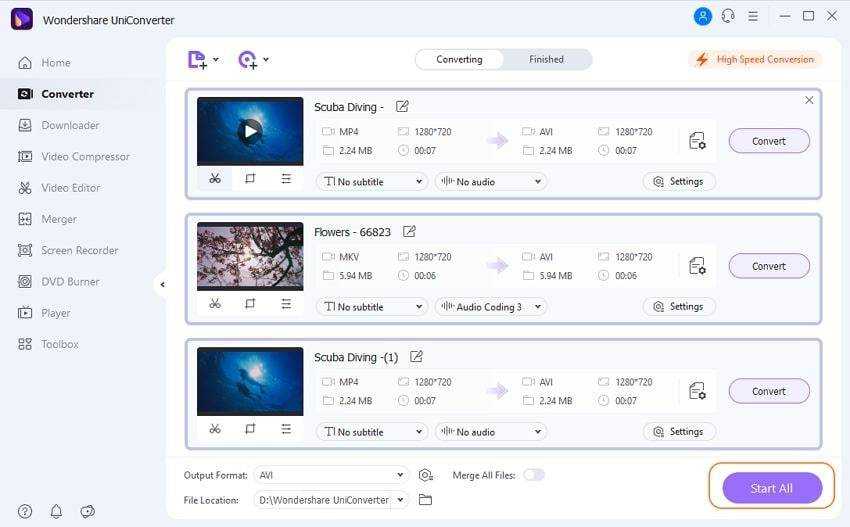 Наконец, нажмите на опцию Начать в нижней части интерфейса, и ваши видео будут преобразованы со всеми сохраненными изменениями.