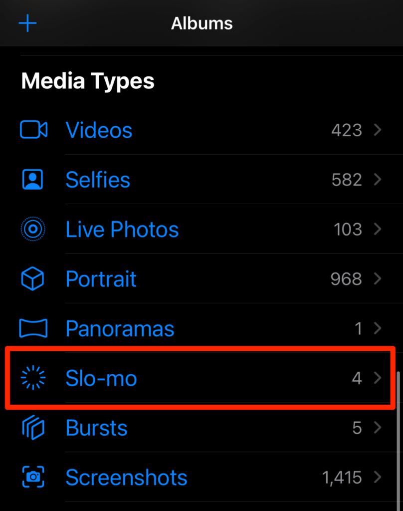 - Launch the Photos app, scroll to the “Media Types” section and select Slo-mo.