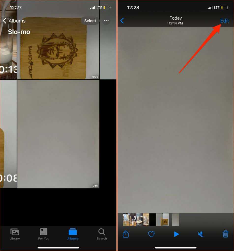 - Select the slo-mo video you want to trim and tap Edit in the top-right corner.