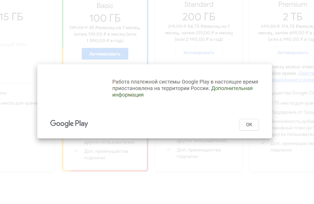 Активация подписки Google One стала невозможна по внешнеполитическим причинам. Ограничения распространились не только на местные счета Visa и Mastercard. Работа платежной системы Google Play была полностью приостановлена на территории РФ. Сама корпорация объясняет ограничения нарушениями в переводах средств.