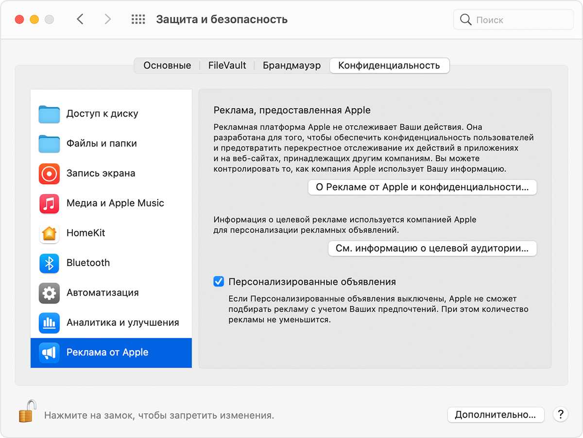 Отключите показ персонализированных рекламных объявлений, чтобы ограничить объем информации, которую использует Apple для подбора подходящей рекламы.