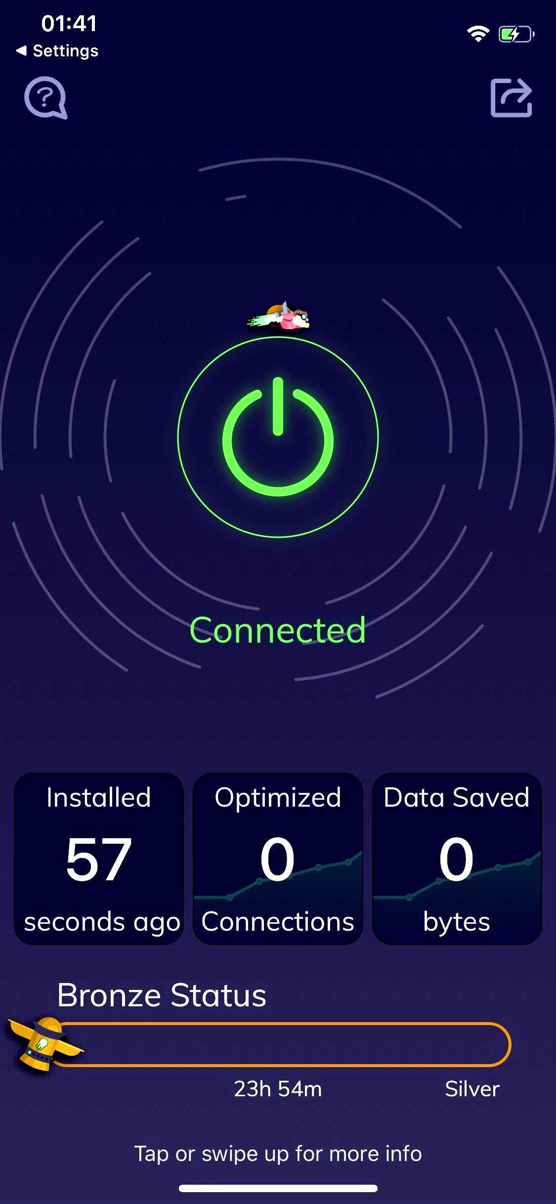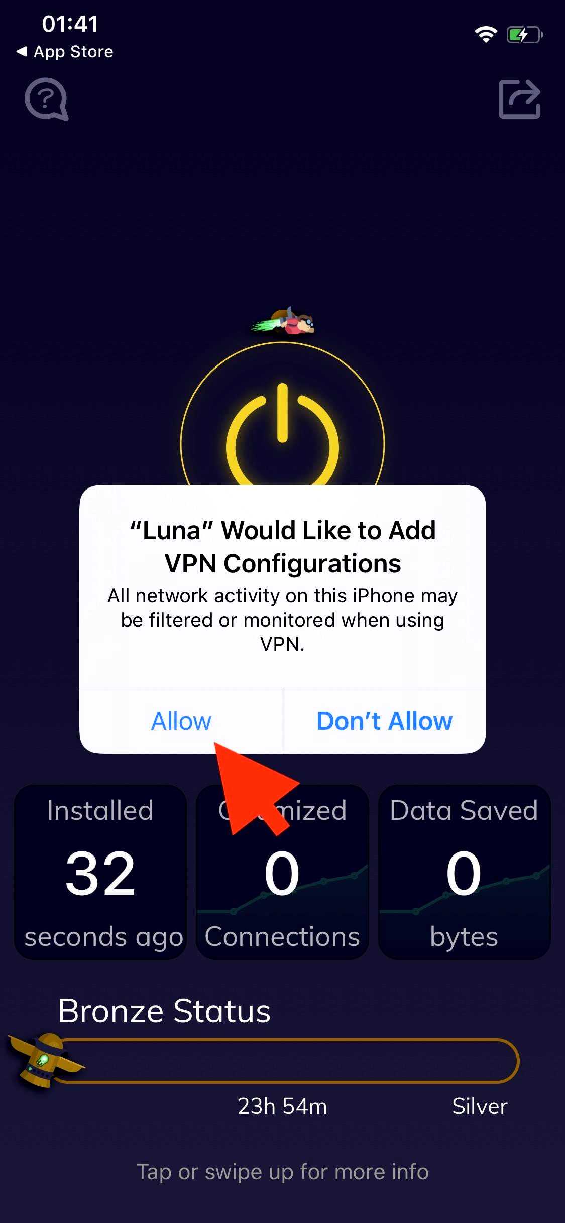 Для начала загрузите и откройте Luna на iPhone и убедитесь, что вы подключены к Wi-Fi, иначе приложение не будет работать. Затем нажмите кнопку питания в центре страницы, нажмите “Разрешить”, когда приложение спросит, хотите ли вы добавить конфигурацию VPN, а затем введите свой пароль. Наконец, Luna автоматически подключится к VPN. После подключения реклама должна исчезнуть из всех мобильных игр, загруженных из App Store.