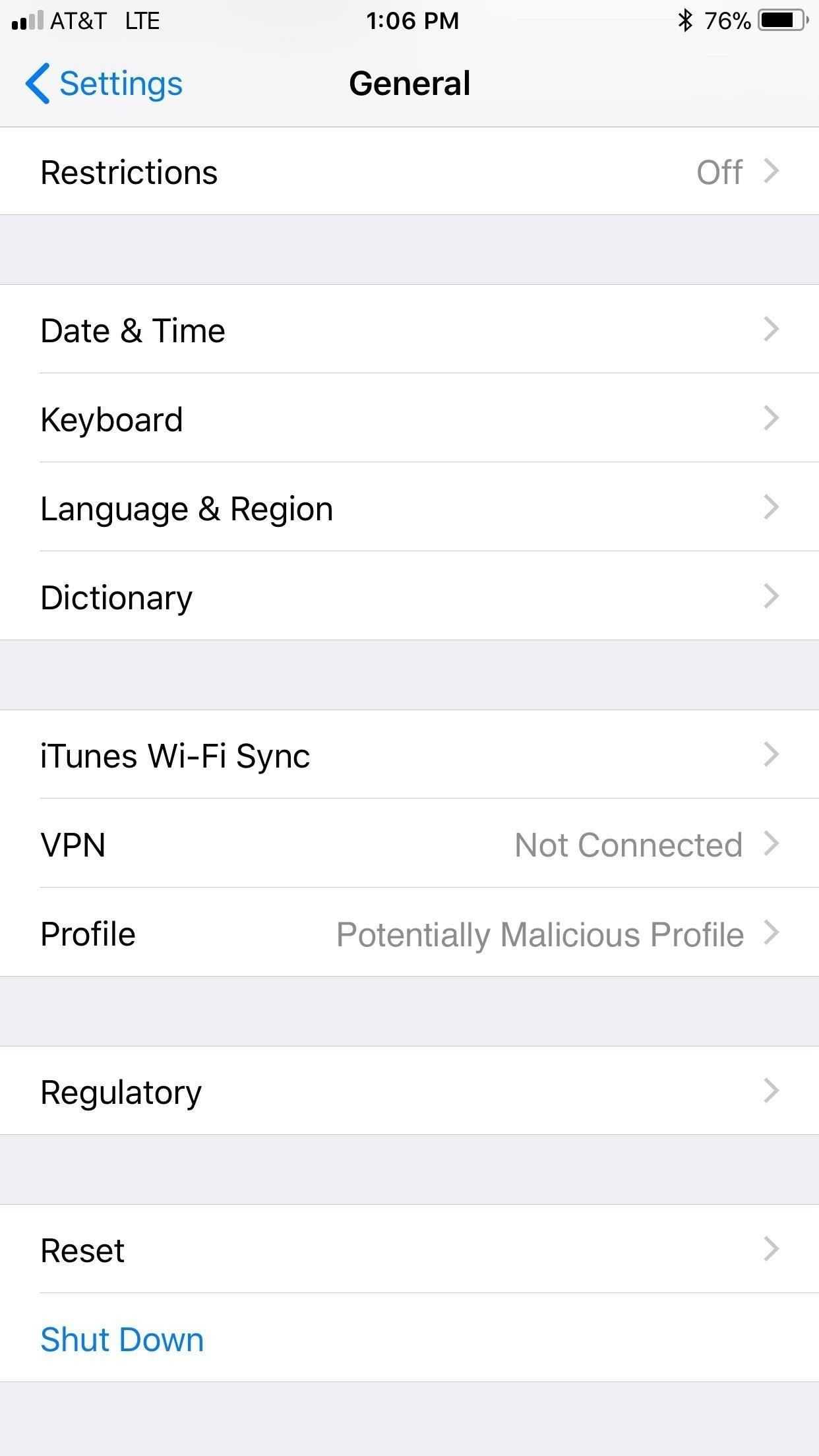 Чтобы убедиться в этом, зайдите в приложение «Настройки», нажмите «Общие», затем прокрутите вниз и нажмите «Профиль». Если существует профиль, который, по вашему мнению, не должен быть там, вы можете нажать на него здесь. Затем нажмите «Удалить профиль». Затем вам нужно будет ввести свой пароль и нажать «Удалить». Наконец, перезагрузите ваш iPhone.