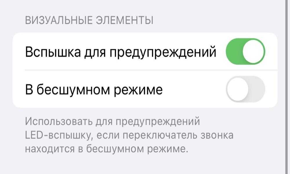 - Пролистать вниз до раздела с визуальными элементами и активировать тумблер «Вспышка для предупреждений».