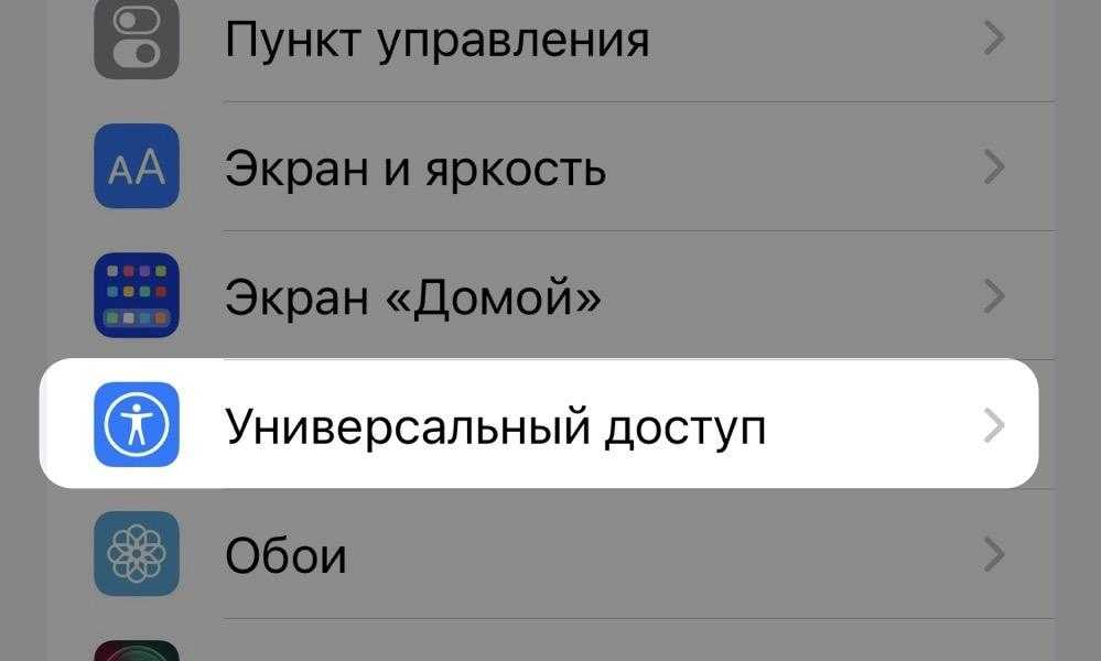- Если у вас установлена iOS 13 или более новая версия, то надо кликнуть по голубому значку с надписью «Универсальный доступ». Если используете более раннюю версию системы, то нужно найти аналогичный раздел в поддиректории «Основные».