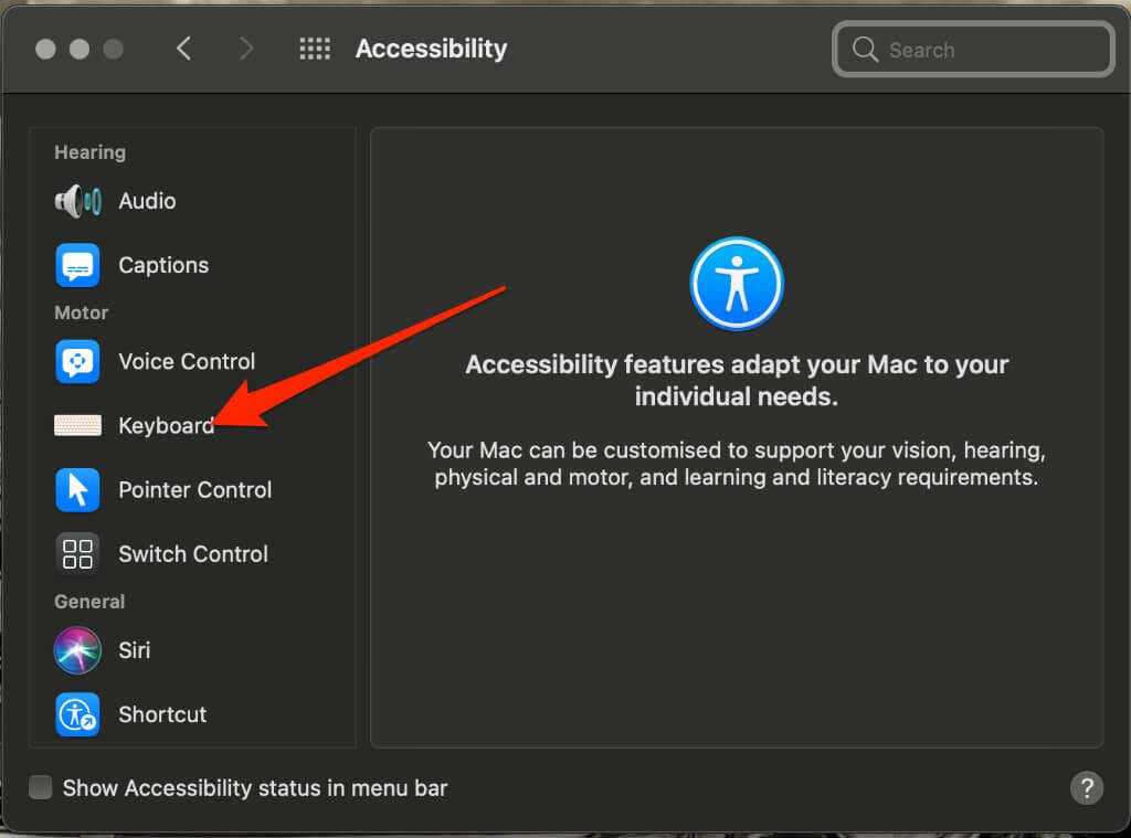 - Выберите «Универсальный доступ», а затем выберите «Клавиатура» из списка в разделе «Мотор».